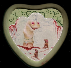 KF: My artwork is my way of venting. When I was a kid, I would tear around screaming and throwing things because the daily frustrations of life never set well with me. Through the efforts of many many child therapists and shrinks, I learned to vomit all that screaming into artwork. My earlier work was filled with alot more blatant rage and confusion because that was where my head was at. When I was 24 years old with a toddler, going through a hostile divorce, trying to put myself through college while working multiple jobs- I was fucking pissed and confused at why things had to be such a struggle. But the older I get, the more I realize "Oh... that's just life". The trauma and struggle and frustrations just go hand-in-hand with breathing. Since my attitude has changed over the years - so has my art. Instead of the kicking, screaming, "Oh yeah? Well fuck YOU!!", I now try to turn the frustration and pain into something I can laugh at so I don't lose my mind and eat a bullet. All the pieces that I've made lately have to do with isolation, self-destruction, and mania (because these are the things that run through my head all day). Not the kind of isolation and self-destruction that would make me a candidate for 24-hour psychiatric supervision.... but that feeling that you get after 3 weeks straight of stressful and bad days, and you're laying on the floor thinking to yourself "Goddamn, a great big handful of pills sounds like a really good idea right now". (Everyone thinks that... right?... or is it just me?). But instead of a handful of pills, I make mean and funny art. And I make it as pretty as possible, because I'm sick of it being so ugly in my head.