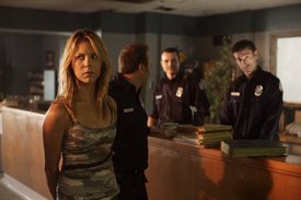 When next we meet Karen, she is a drifter, traveling the road and taking what she needs, including the vehicle of a murdered man who is most likely another hapless victim of Basement Jack. I liked the grittiness and pragmatism of her character, a far cry from the usual weak, helpless gore-queens of most horror movies. When she reaches the small mid-western town where Officer Chris Watts (Sam Skoryna) is struggling to overcome his rookie bumbling and where Basement Jack has already made his first appearance, she faces the demon she has come so far to find. She must convince Watts just who has arrived in his town and how they have to stop him. His initial skepticism over the revelation that Jack is a serial killer that follows the weather, lightening storms are his trigger to kill, and that he lives in the homes of his victims for weeks(hence his moniker of “Basement” Jack) before slashing them to pieces then posing the bodies like mannequins is quickly overcome as more bodies turn up. The two race to stop Jack even as he sinks deeper into the bloodlust that is conjured up with every stroke of lightening that splits the sky open.