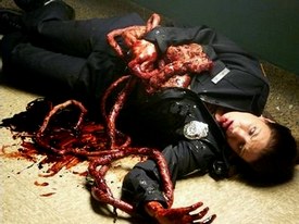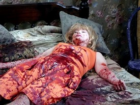 Karen Cook (Michele Morrow) insists her boyfriend take her to her front door which lies just a few yards distant. When the two enter her home they find the lights don’t work and the entire family is sitting in the dark, in the living room. Needless to say, the cut throats and severed limbs are a dead giveaway that something is amiss.