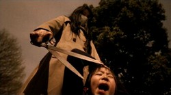 I've been a big fan of J-horror for quite some time now, since around '98. To be honest, I'm getting pretty fucking sick of it. How many movies can you make w/ghostly girls w/long black hair? Combined with all sorts of technophobia, haunted computers and cell phones and videotapes, enough is enough already. I even hated Takashi Miike's ONE MISSED CALL and I'm a huge Miike fan. So, I was a tad skeptical when I picked up CARVED: THE SLIT MOUTHED WOMAN. Was this going to be another RINGU rip off? I'm very happy to say, not at all. CARVED is not only one of the best Japanese horror movies I've seen in a while, but one of the better horror movies period to come out in some time. It's a J-horror mixed with an 80's style American slasher and it worked for me.