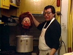 Now on the other hand we have, VIDEO VIOLENCE. It’s Z budget trash, but it seems there was an effort to make something of substance here (isn’t that cute?). For one, you can tell that the makers of the film were really into horror, not just trying to make a quick buck and second, the plot is actually a good one. The plot sort of reminded me of an old EC comics story (Tales from the Crypt, Vault of Horror, ect.). A movie theater owner from New York moves to a hick town to run a video store. Someone returns a rental that is a real snuff film. The guy goes to the police, but they don't believe him and through some strange occurrences he's put in a 'boy who cried wolf' scenario and has only his wife to believe him. Meanwhile people are being killed left and right by two serial killers that film all of their killings and the tapes keep ending up in the hands of the video store owner. Soon he has no choice but to take matters into his own hands.