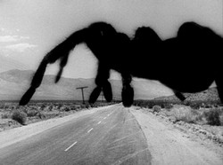 As he drives across the country to Deemer's the Tarantula is seen crawling behind the mountain side in the distance.