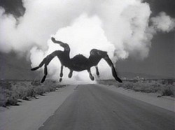 Later on in the night, horses start to get riled up as they sense something coming. Slowly, the Tarantula, now gigantic, comes down over the hill, as it descends on the horses, it starts to feed. When Andy arrives, his riffle does nothing as it moves to eat him.