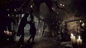 While Masbeth waits outside, Ichabod watches as the witch chains herself to the wall and prepares a spell. After breathing in some smoke, she stops moving. When he tries to touch her, her veil lifts to show her face, eyeless and corpse like. She then jumps onto him (being held back by the chains), tells him where and how to find the Horseman's grave, and then collapses.