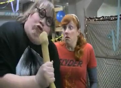 As promising as all that might sound, the sad reality is that FILTHY 2 is a mostly disappointing affair. Sure, this eloquently titled (and misspelled) "MAXIMUM DOUSCHE" is just as outlandish and offensive as the first FILTHY flick, but, in all honesty, doesn't really hold a candle to the original. Truthfully, I consider this entry to be the weakest link in the FILTHY MCNASTY series, and I'll even go so far as to say that this is one of the few pictures in the Low Budge Pictures canon that is, in many ways, actually more bad than good. Though it has several inspired, uproarious moments (the Jello pudding jubilee comes to mind immediately as an extremely high point, as does the nihilistic punchline ending), the combination of bland characters (outside of Phil and Razor, the only character I found memorable in a good way was Johnny Douchebag, who is admittedly something of a throwaway character anyway), annoying characters (Dave Autovino's return as "The Max" made me want to blow my fucking head off, and, though I normally like Lauren Pushkin's performances in Seaver's films, I found her turn here as an overbearing otaku bimbo incredibly shrill and tiresome... funny at first, but grating soon thereafter), a humdrum meandering plot, and the worst lighting of any L.B.P. movie I have ever seen (seriously, there are scenes where you can't see anything that's happening onscreen whatsoever). Not even the obscuro SUBSPECIES jokes were able to save this let-down. What a bummer.