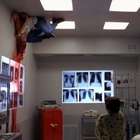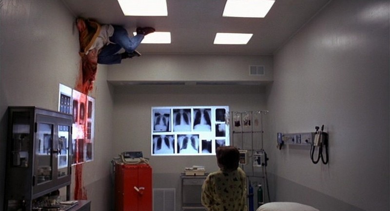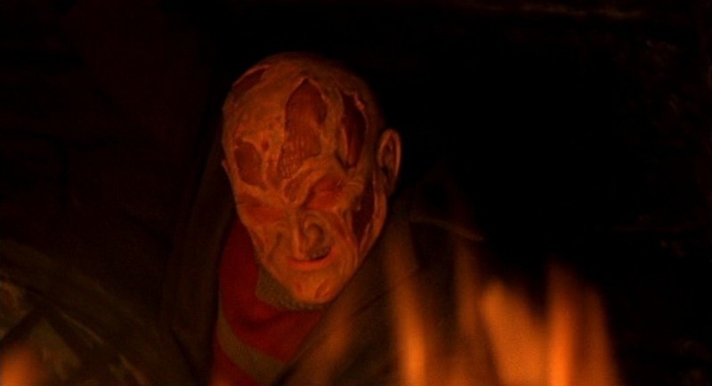 Heather falls asleep in the chair in Dylan's room. Nightmare time! Heather hallucinates that Dylan is sitting in the bed and then speaks in Freddy's voice and vomits on her. The nurse comes in, only to appear as Freddy to Heather, and is ready to cut the evil out of Dylan.