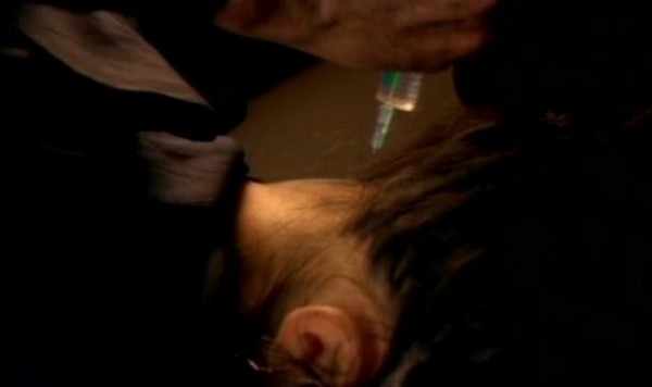 As the girls discuss the idea of leaving, Jenny begins to get sleepy and the good doctor goes into his basement (where the trucker is all bound up) to get a towel and a hypodermic needle full of something that I can assure you isn't for anything good. Of course he tells the girls exactly what he did and injects Jenny before she can get away.