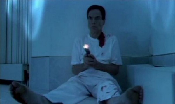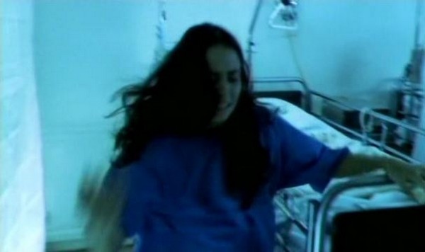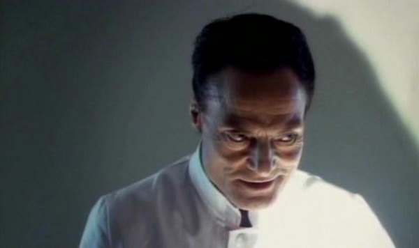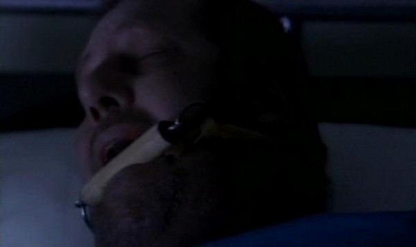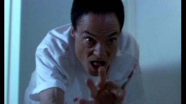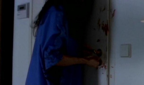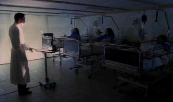 So after his little display is done and over with, our man Mr. Heiter goes about administering shots to put his patients under. However, as he is putting out both Lindsay and Katsuro, Jenny manages to loosen her bonds and make a break for it. Note to aspiring escapee: I know that it is a situation of emotional distress and you're fearing for your life, but for future reference when you're escaping from the hospital bed a madman has forcibly tied you too, you might want to consider removing the IV drip before you make a break for it. Jenny forgot, and it leads to one of the only cringe worthy gore effects in the whole movie: The IV gets ripped out and blood splatters at the camera. The only reason I even got the cringes is because I hate needles.