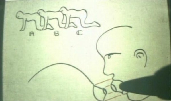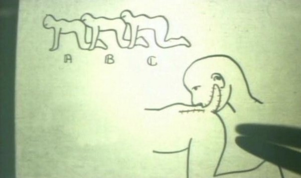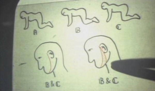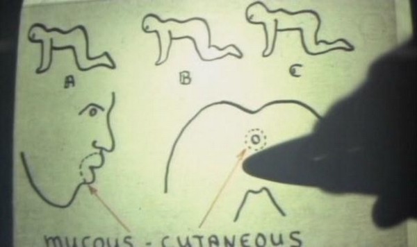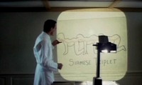 What happens next is finally Plot Point #1: After giving the characters a run down of his credentials, the doctor turns on an overhead projector and explains what he is going to do to them. Yeah, the first plot point of the film is an lecture on overhead about how he's going to surgically attach the three people ass-to-mouth. The characters in the film are horrified, meanwhile, I'm here on my couch laughing my ass off. I couldn't keep it together through this part, it was the drawings on the overhead projector. All I could picture was how they resembled the type of crap my grade school teachers would draw on their projectors to teach us multiplication tables or the proper use of adverbs in a sentence. So I'm envisioning this guy teaching a class of 25-30 Grade 5 students how he's going to pluck out peoples teeth, graft their mouths to the anus of the person in front of them, and cut the tendons in their legs... Guess you had to have been there.