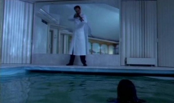 So she makes a break for it, locks herself in Heiter's room and attempts to defend herself with a lamp. When she refuses to open the door for Heiter (Come on man, seriously, with a sell feature like "I'm going to pull out your teeth one at a time" she's not going to throw the door open for you like you're a long lost lover!) Heiter goes outside and smashes the window to get at her. She flees further down the house and ends up in his indoor pool. Now when she refuses to get out of the pool Heiter simply closes the pool cover over her in an attempt to drown her. Once the pool is covered, for no explainable reason, the power goes out and Heiter leaves the room.