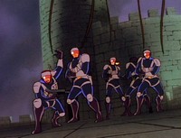 Goliath and the elderly one go to end the invading army, but find they've been tricked and turn to stone again as the sun rises. Worse, the Captain of the Guard has betrayed his castle and let the army capture the Princess and destroy the Gargoyles. Goliath and his five remaining companions attack the army the next night.