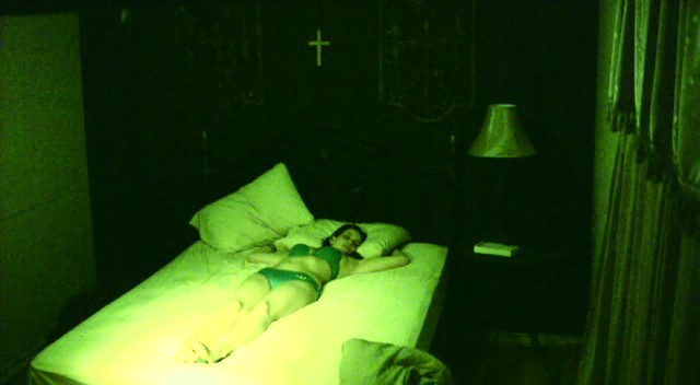 As is the case with many films of this genre, some low-life feels the need to try and capture all of these odd and unnatural occurrences on tape, and that someone would be the son of the family, Thomas. Thomas sets up cameras in all three of the bedrooms as well as one in the living room in the hopes of capturing some paranormal activity (see what I just did there?). From that point on, the film is basically the standard stuff that you would expect from a low level P.A. cash-in. Crosses fall off of walls, sheets are pulled off of a conveniently (and thankfully) half naked Samantha, doors slam shut, doors open, lights flicker and the Finley family becomes increasingly frightened for their physical safety as things escalate.