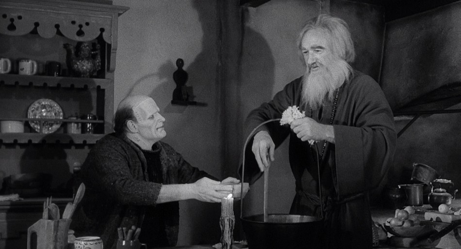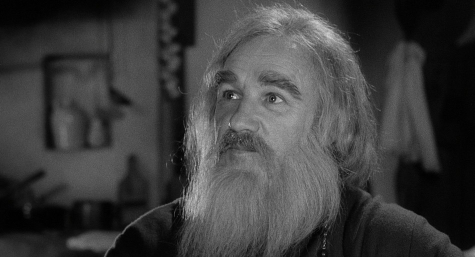 Later that night an elderly blind man prays to god that a companion will eventually join him. The creature then breaks in and the blind man accepts him as his prayer answered and offers food and shelter. At first he tries offering him soup, but he just continually spills it in his lap. He then offers wine but breaks his mug during the toast. Finally, he accidentally lights his thumb on fire while trying to light a cigar, which causes the creature to break out in a rage and leave, much to the blind man's disappointment.