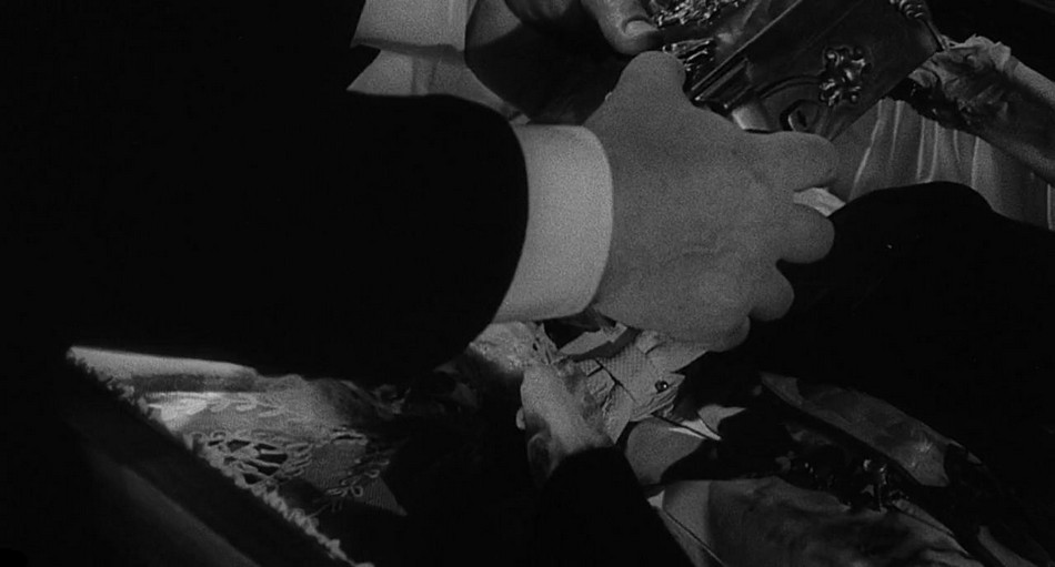 Inside, we find the casket of Baron Van Frankenstein. It suddenly opens as his nearly rotted away skeleton is shown. The camera then pans down to a locked box being held by the bony hands. Two hands then slowly grab the box and try to take it away, but the skeleton still remains attached and pulls it back. It takes another try to get the box back.