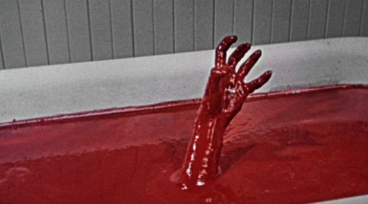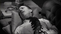 We have two Gimmicks at play here, readers. First off, the bathroom sequence in which vibrantly red blood spills from the faucets. A fairly simple though cunning and sophisticated trick, Castle filmed these sequence using color film stock - and painted the set (and Judith Evelyn) in grayscale. It matches beautifully, though if you look closely at the chrome of the faucets, you can see the deception.
