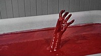 Chapin pays a follow-up visit to Martha, giving her a shot of muscle relaxant and a prescription for sleeping pills. She goes to sleep, but is soon roused by a grisly, hatchet-wielding zombie that chases her around the house until she takes refuge in the bathroom, where the sink and tub faucets immediately fountain forth brilliant scarlet blood - in the midst of a black-and-white film! This proves too much for Martha, who keels over, stone dead.