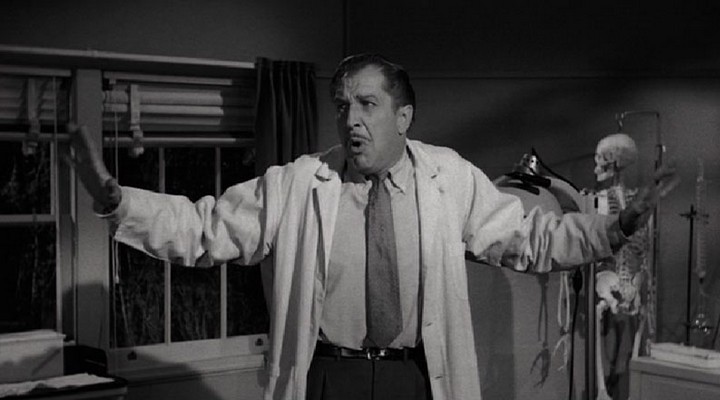 Dr. Warren Chapin (Price), a forensic pathologist, is in the midst of autopsying a recent execution as confirmation of death when a small, balding, nebbish man - Oliver "Ollie" Higgins (Coolidge), a curious relative of the deceased -- interrupts him. Driving Ollie home after his work is done, Chapin warms to him as he, with his wife, maintains and runs a small local theater that screens older, silent films.
