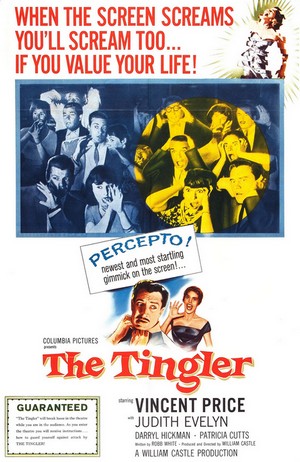 Inarguably, the King of the Gimmicks was producer/director (and sometimes actor) William Castle. In 1958, for the film Macabre, he offered certificates of $1000 life insurance from Lloyd's of London, and stationed fake nurses in theater lobbies and hearses in the parking lots. In 1959, he sent glow-in-the-dark skeletons zipping over the audience ("Emergo!") for The House on Haunted Hill. However, it is with the film we are concerned with today that Castle perhaps reached his pinnacle of gimmickry. I speak, of course, of 1959's The Tingler.