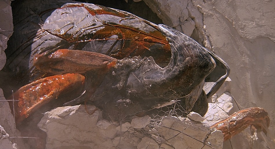 Now knowing what they're capable of, both ride as fast as they can, intending not to stop until they hit Bixby. However, the horses get wind of something and panic, knocking them both off. Val and Earl watch in horror as one of the serpents is wrapping around one of the horses and kills it. After shooting one of them and it retreating underground, the ground beneath there feat suddenly rise until they jump back. It's then they see the real beasts. The monsters are in fact huge creatures with the serpents meant to be tongues to pull in the prey. After several failed shots, they then flee with it following behind. Coming upon a concrete aqueduct, they try to jump it but fail, but in the process cause the monster to ram into the concrete, barely break through and kill it.