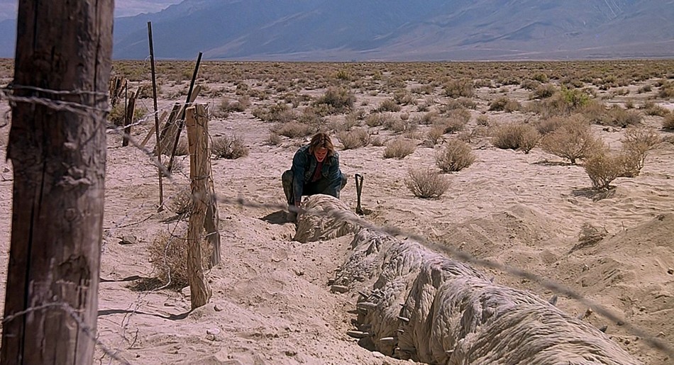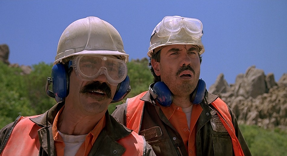 The movie begins with the title shifting to a Nevada valley at a cliff drop off. Valentine McKee (or Val) is taking a leak over the edge. He then goes to the back of the work truck where Earl Basset is still asleep and he awakens with a false stampede. They then decide on who will make breakfast over Rock/Paper/Scissors, Val loosing. They begin working on the fence which is the reason they're out at the cliff (them being handymen for hire). They then discuss how not having a plan is how they're stuck doing lame work. Once done, they drive back through the valley discussing there next job. Along the way, they see the new college girl camping out and visit her, Val hoping she falls under the category of his last lover who was rather blonde and dumb. Instead, Rhonda is more a tomboy. While greeting, she questions them on weird readings she's been getting from her equipment. After they leave, Earl rants about how limited Val's qualities are for a woman.