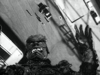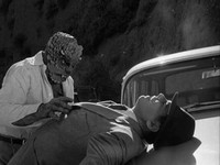 The film has it's humorous moments as well, some of which I highlighted in my synopsis, such as Buckell's line regarding "whiskey and science" and George's gun transforming from an American-made Colt 1911 to a German Luger when exposed to sunlight. The best, however, has to be in the suit itself. To save cost, only the top half of a lizard suit was made. Chest, arms, hands, head. Below the waist, Clarke is clad in slacks and shoes. Now, funny thing about rubber. It's not an absorbent material, and in an outfit of rubber you will sweat. And sweat Clarke did, and throughout the finale of the film, one can see where that sweat trickled down the rubber, soaking Clarke's pants. You guessed it; it looks like the Hideous Sun Demon is also the Incontinent Sun Demon.