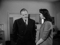 Dr. Frederick Buckell, McKenna's superior, discusses the matter with his attending physician, and reveals that the isotope whose rays McKenna had received was artificial, never having existed in nature. He also reveals, in calmly discussing the situation with McKenna's assistant (and apparent schnoogie-woogums) Ann Russell (Manning) that the accident is McKenna's own fault - McKenna was hung over on the job! "Whiskey and soda mix, not whiskey and science!" Buckell moralizes.