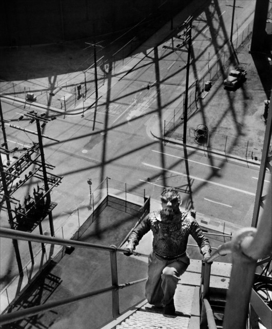 George shows up at her apartment, marching McKenna outside at gunpoint, where the sunlight turns George's gun from a Colt 1911 to a Luger, and McKenna from a wimpy, handsome scientist into a ravening lizard-man. With George dead, McKenna goes on a rampage across the bleak landscape of the Los Angeles oil fields. He terrorizes women and children, tears apart a German Shepherd, and while hiding in a shack, befriends the most irritating child this side of the Gamera franchise.