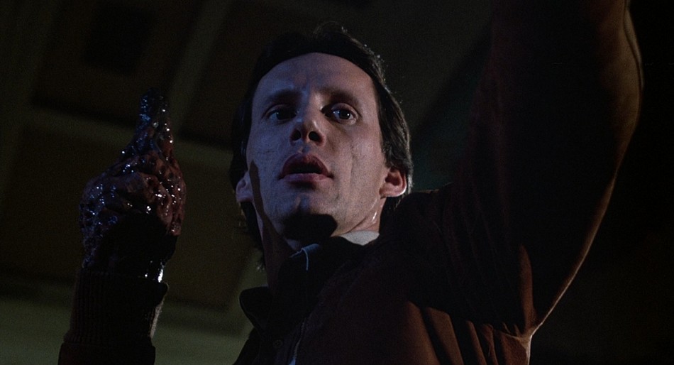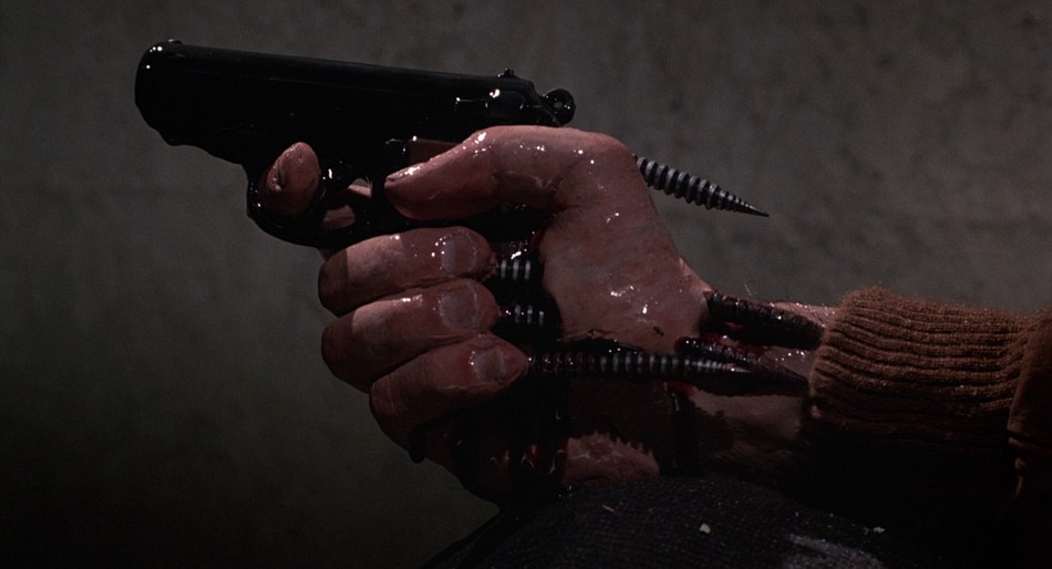 After swapping bodily fluids via needle pricks, Brand shares her desire to be bound, shocked and fucked on Videodrome's smarmy set. As you can imagine, everything digresses from this point, and reality and fiction are blended: hands transform into sinewy guns, chests turn into gapping, vagina-like videocassette slots, and people turn into blubbering piles of torn muscle and broken bone.