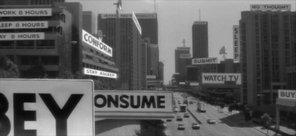 Taking refuge in a flop house, the Rowdy Boy realizes that these Blu-Blocker knock-offs go beyond fashion. With these shades comes a frightening revelation: Aliens are among us. Camouflaged in skin, these creatures have acclimated themselves into our society, and established a footing in both the public and private sectors. These aliens are only reveled in all their hideousness to those wearing these shades. More than that, one can see how magazines, billboards and television are nothing more than conduits by which these aliens are subliminally controlling our behavior. A billboard high above the city street carries a single word, "Conform." Magazines instruct, "Consume and reproduce." Money reads, "This is your God."