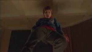 A recurring theme in The Gate is that of children in mortal danger, without even the protection of their parents. Glen’s parents are away for the weekend, leaving his sister Al (Christa Denton) in charge. And when the gate begins to open, the forces within want nothing more than to mess with the heads of their young adversaries. First there’s Terry, with his dead mother and absent father, and no true parent but his metal albums. So how to the demons get to him? They show him his mother, calling out to him in angelic form. Naturally the bereaved boy runs to embrace her, only to find she is in fact the dead family dog. Even creepier is the sequence later when, just when things are getting bad, Glen’s parents appear on the doorstep. Again, the son naturally runs to embrace them, only for his father to intone in an atonal voice not his own (several voices, in fact, at several different pitches), “you’ve been bad!” and proceeds to lift Glen by the throat. Defending himself, Glen shoves his fingers into the face of his father, which breaks open, spilling gallons of puss; and as Mom laughs like a wicked witch in the background, Dad’s head falls straight off. (Seriously, Monster Squad’s Dracula roaring at a four year old girl “Give me the amulet you bitch!” was nothing compared to this.)