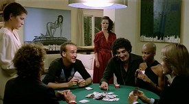 Up until this point, Alex comes off as a charismatic "Guido", but likable. It isn't until things get violent when you remember--oh yeah; he's also a rapist and a murderer. From here on out the group go from partygoers to hostages and Alex plans on using them for 'his' own amusement. The excellent aspect of the film is - you don't really like the victims - they're assholes, you almost root for Alex (Ricky's conscience soon gets to him and wants no part of Alex's "fun"). There is a scene where Tom gets his head violently and repeatedly bashed into a table and later, Howard gets beat up and tossed in the pool (and then gets pissed on - literally, by Alex) and I didn't really care - they're both assholes! Even the "rape" scene with Lisa shows her getting 'in to it' as if she secretly lusts to be man handled by a low-class thug. It isn't until a 5th member of the group shows up and Alex goes psycho to the extreme and any likeability he had goes out the window.