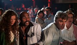 Demons 2 comes straight out of the school of 'if it ain't broke, don't fix it.' Kicking off at some point in the years following the first movie with no explanation as to how the impending demon apocalypse was averted, the action this time occurs in a high-rise apartment building. Again there's a diverse bunch of people, couples and families and young yuppies, amongst them a couple of the same actors from the original: head joyrider punk as a security guard, and big bald badass black dude, intriguingly having upgraded from Travolta's Saturday Night Fever look to Travolta's Staying Alive look as a string-vested bodybuilder. It's also the screen debut of Asia Argento - but don't get excited, she's about ten years old. The media violence debate allegory is perhaps even more blatant here, as a TV show about the demons lights up every apartment, beaming the evil directly into the home. When a preppy girl's super sweet sixteen doesn't go the way she wants it to, she runs off to her room to sulk in front of the idiot box, and before you can say 'stupid spoiled bitch' she's sprouting fangs and claws and oozing slime. Then the party livens up somewhat.
