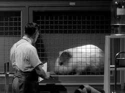 Back at the lab, Deemer begins work on a mystery substance and preps a shot. Going deeper into the lab, giant animals in cages are shown, mice and guinea pigs far beyond normal size as the Professor gives a small one a shot. Walking down the lab, a chart with the bigger animal's shot/day ratio is shown as he reads them.