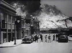 Taking formation, they attack the Tarantula. The first rockets do nothing to harm it. They then try the Napalm explosions. After dropping all they got, the Tarantula finally catches on fire and burns to death. As Hastings, Stephanie, Sheriff and Joe all watch though, they remain silent in the celebration.