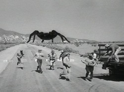 When she flees the house, Hastings arrives and helps her, watching in horror as the giant beast destroys the house. As they flee, they notice the Tarantula is chasing them.
