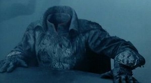 In town, Killian and his family have just finished dinner, but while his wife and son are in the back, the Horseman breaks in. He tries to fight him off but fails and loses his head. While his wife hides their son under the house, the Horseman comes in with his axe and the head of her husband and kills her. Before leaving, it turns around and cuts a hole into the floor and grabs the child (presumably killing him).