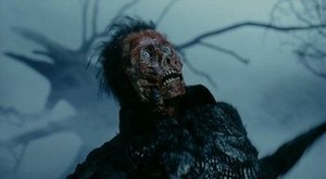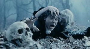 Further investigating, he finds the horseman's grave which has been dug up already and the skull taken. He then deduces that whoever has taken it is the real person behind the killings. Before he can investigate more though, the Horseman erupts from the tree and charges for the town, with Ichabod following.