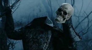 While Masbeth knocks out Lady Van Tassel, the Horseman grabs Katrina and readies his blade. Just before he swings, Ichabod grabs the skull and throws it to him. The Horseman then lets Katrina go and reclaims his head.