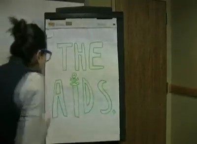 Graduating from smaller roles in flicks like FILM CREW and SKI WOLF, Desiree Saetia (a.k.a. Desiree Dark, Saetia LaReoux) plays a gawky, geeky, homely little Sex Education teacher, vainly trying to inform her empy-headed students about the dangers of A.I.D.S. and all that jizzy jazz. The rowdy retards in her charge include a zit-faced, four-eyed, fat guy-gone-nutzoid (played by Shawn C. Phillips, who you may know from the online sensation that is The Don & Murph Show, or from his appearances in flicks like BANSHEE!!!, ASSAULT OF THE SASQUATCH, and Chris LaMartina's PRESIDENT'S DAY), Shawnny Ramone (a loveable Joey Ramone lookalike whose performance is based almost entirely on Dee Dee Ramones' role in ROCK & ROLL HIGH SCHOOL, and who is played by none other than, ahem, "Clark Westfield", who is in actuality the founder of the V.H.S. Preservation Society), a pair of hooter-wobblin' bimbos, and, making his glorious return to the limelight, numbskull narcissist (and L.B.P. fan favorite) Choach (longtime viewers should remember him from such past outings as TEENAPE GOES TO CAMP and CARNAGE FOR THE DESTROYER), who brightens everything up with his wide array of psychedelic wardrobe items.