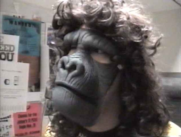 Also prancing about in this actively stupid slab of silly, surrealist/absurdist buffoonery are the characters of Bonejack (played by Chris Seaver himself wearing, in an irreverent n' offensive invocation of the poorest of poor taste, blackface) and Teen Ape. In all the long and horrid history of Low Budget Pictures, no two characters have ever been quite so beloved as Bonejack and Teen Ape, and it's easy to see why. Intended as a combination of Don King and Bill Cosby, Bonejack is a loveably lecherous crackpot with that classy I've-just-been-electrocuted hairstyle and an unquenchable hunger for Jello puddin'. As promising as that characterization is, what has really made Bonejack such a hit with fans, I think, is Seaver himself, whose wonderfully twitchy performance is strange-beyond-strange. What makes Teen Ape so popular, meanwhile, is something different.
