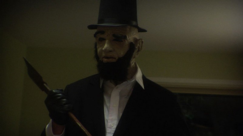 Of course, if you're watching a no-budget horror flick about fresh-faced teenyboppers gettin' offed by a lunatic in an Honest Abe mask, you're probably not caring too much about the acting, pacing, or subtext. You're probably more in the market for sex, death, and stupid humor. There's plenty of all three, naturally. I've already mentioned, at length, the carnal powerhouse that is the depressingly underused Miss Heath character. And the fact that the entire plot itself sounds like one low brow gag with a lame (read: awesome) punchline should clear up any confusion about whether stupid humor is prevalent here. Granted, it's not as over-the-top or in-your-face as something like, say, TERROR AT BLOODFART LAKE or DREAM REAPER, but, in this case, playing the comedy dry was simply the right way to go. It helps cement PRESIDENT'S DAY as the facetious parody/homage combo that it successfully tries to be. Finally, when it comes to the morbid n' macabre, rest assured: there's killing n' carnage aplenty. Memorable murders include an axe to the back o' the skull whilst givin' cunnilingus, a guitar shoved down a gaping maw, a trophy through the face, a paper-cutter beheading, a hair-straightener schnoz-scorching, a mop-bucket head-squish, and an extremely juicy eyeball gouging that'd give Lucio Fulci a stiffie for sure. That's just the tip of the iceberg, my friends.