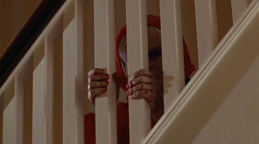 As the lightly disturbed granddaughter peers upwards to see if whoever attacked her grandmother has disappeared, the miniature attacker appears again, hissing, and leaves tiny blood stained handprints on the house's pristine white bannister.
