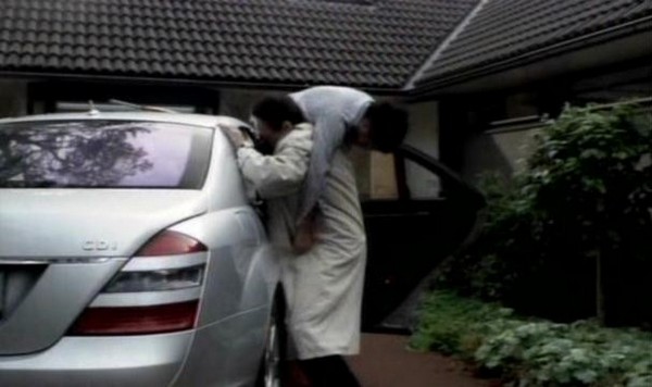 He starts by capturing a trucker while he's making a road side delivery of processed goods that are certainly not meant for any store. This is our opening sequence in the film, a creepy German doctor sneaking up on a fat truck driver taking a dump and kidnapping him.