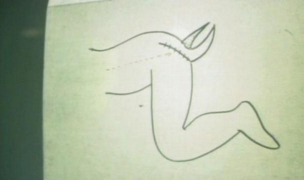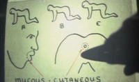 What happens next is finally Plot Point #1: After giving the characters a run down of his credentials, the doctor turns on an overhead projector and explains what he is going to do to them. Yeah, the first plot point of the film is an lecture on overhead about how he's going to surgically attach the three people ass-to-mouth. The characters in the film are horrified, meanwhile, I'm here on my couch laughing my ass off. I couldn't keep it together through this part, it was the drawings on the overhead projector. All I could picture was how they resembled the type of crap my grade school teachers would draw on their projectors to teach us multiplication tables or the proper use of adverbs in a sentence. So I'm envisioning this guy teaching a class of 25-30 Grade 5 students how he's going to pluck out peoples teeth, graft their mouths to the anus of the person in front of them, and cut the tendons in their legs... Guess you had to have been there.