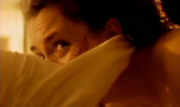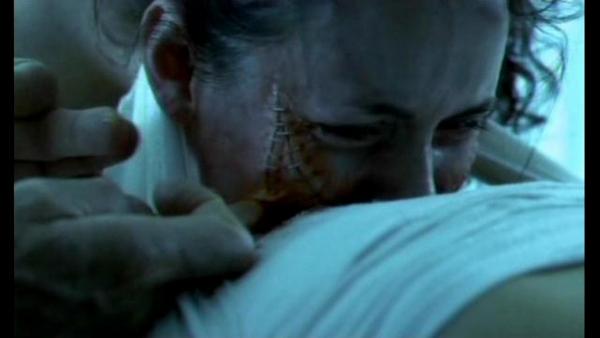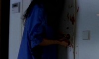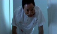 So after his little display is done and over with, our man Mr. Heiter goes about administering shots to put his patients under. However, as he is putting out both Lindsay and Katsuro, Jenny manages to loosen her bonds and make a break for it. Note to aspiring escapee: I know that it is a situation of emotional distress and you're fearing for your life, but for future reference when you're escaping from the hospital bed a madman has forcibly tied you too, you might want to consider removing the IV drip before you make a break for it. Jenny forgot, and it leads to one of the only cringe worthy gore effects in the whole movie: The IV gets ripped out and blood splatters at the camera. The only reason I even got the cringes is because I hate needles.