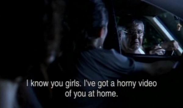 The only help that comes by is a big fat perverted German guy in a wife beater. This is the only fresh permutation of the concept of attractive women being stranded someplace where awful things are going to happen to them. The guy (speaking in German) thinks the girls are from some porno movie that he has and is asking them to go back to his place so they can bump uglies. The whole time they're trying to ask the guy to help them with the whole flat tire thing. When they realize buddy is trying to get in their pants they roll up the window and ignore the fat bastard as he makes obscene gestures and eventually gets bored and drives away.