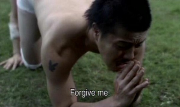 "God. Are you God? I'm just a puny insect. I cast out my parents, left my child, dismissed their love and led a selfish life. Just like an insect. No, my existence is even lower than insects, but... but dear God... that's how I've lived, and this is my punishment. I want to believe that I'm still a human being... Hey girls! Hey mister! What an insane world we live in. "