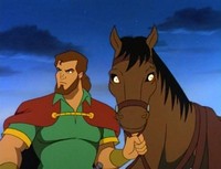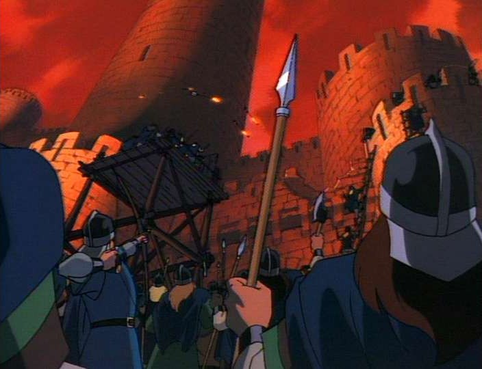 Goliath and the elderly one go to end the invading army, but find they've been tricked and turn to stone again as the sun rises. Worse, the Captain of the Guard has betrayed his castle and let the army capture the Princess and destroy the Gargoyles. Goliath and his five remaining companions attack the army the next night.