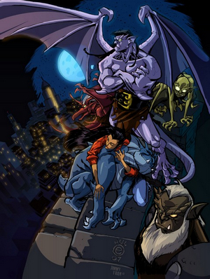 Later though, we learn not only that there are Gargoyles in other parts of the world (England, Japan, South America), but that one from Avalon, Angela, is in fact the Daughter of Goliath and Demona, which would add a whole new factor in the rivalry between Demona's and Goliath's clan. This also adds other tension between Broadway, Lexington and Brooklyn as they finally find a female of their kind and they all long for her (she would ultimately choose Broadway).