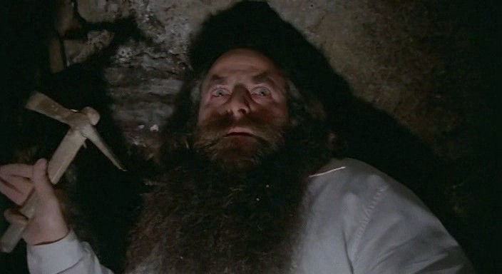 When the zombified Professor Ayres arrives and kills Nicholas, the crew lock themselves up and wait until dawn before making a break for it. They find a monastery and try to get help from the monks inside. Wouldn't you know it, this doesn't work out as they're zombies also and James becomes their Sunday brunch.